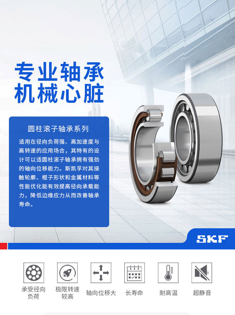 圓柱滾子與滾道為線接觸軸承。負(fù)荷能力大,主要承受徑向負(fù)荷。滾動(dòng)體與套圈擋邊摩擦小,適于高速旋轉(zhuǎn)。根據(jù)套圈有無(wú)擋邊,可以分有NU、NJ、NUP、N、NF等單列圓柱滾子軸承,及NNU、NN等雙列圓柱滾子軸承。該軸承是內(nèi)圈、外圈可分離的結(jié)構(gòu)。